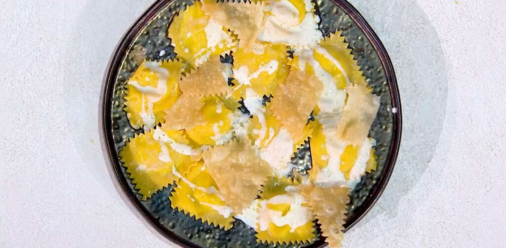 Una volta cotti, scoliamo i ravioli e ripassiamoli brevemente in padella con burro fuso e un po’ della loro acqua di cottura. Impiattiamo i ravioli e serviamoli nappati con la crema di stracchino e decorati con sfoglie di pasta fritta, che abbiamo preparato da ritagli di pasta precedentemente.