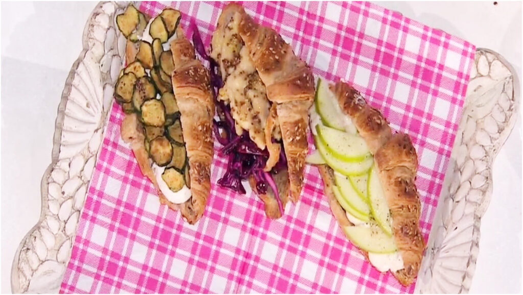 Infine, prendete le brioche salate e tagliatele a metà. Farcitele alternando il composto di formaggi, gli straccetti di tacchino e il cavolo viola. Serve subito e godetevi questo brunch strabiliante!