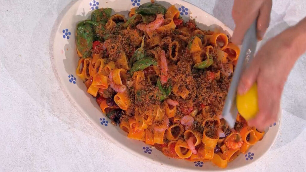 Nel frattempo, cuocete la calamarata in acqua salata e, una volta scolata, saltatela direttamente nella padella con il sugo e un’abbondante manciata di basilico fresco. Servite il piatto completandolo con la muddica croccante, una grattugiata di scorza di limone e i gamberi saltati, sia cotti che crudi, per un contrasto di freschezza e sapore.
