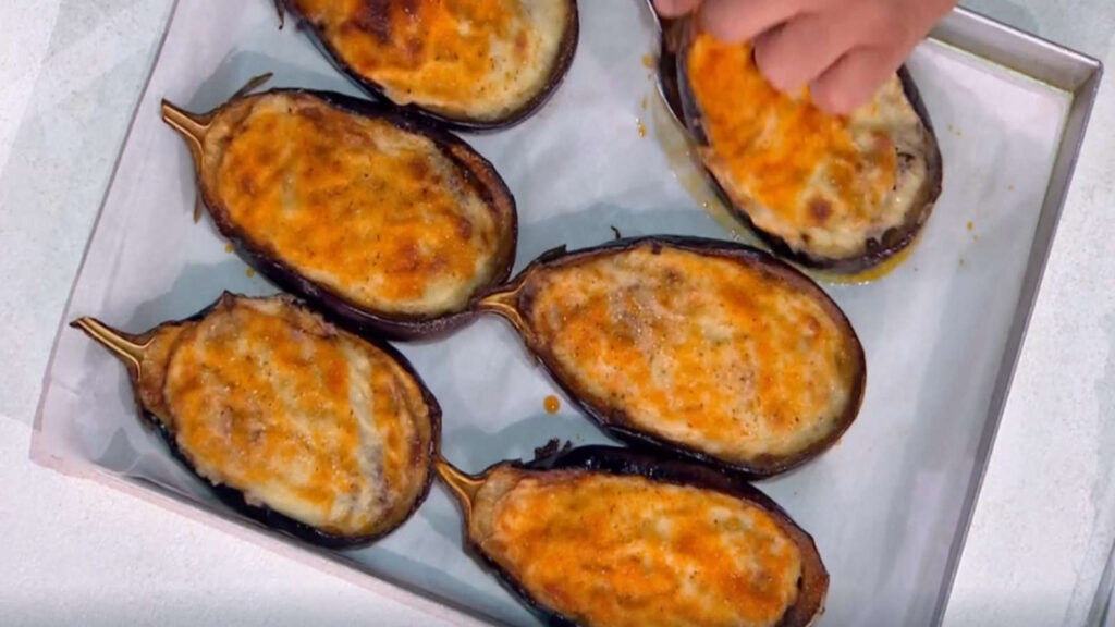 A questo punto, riempire le barchette di melanzane con il ragù arricchito e coprire generosamente con la besciamella al formaggio. Spolverare con pangrattato e infornare in forno preriscaldato a 200°C per circa 25 minuti, o finché non si forma una crosta dorata in superficie.