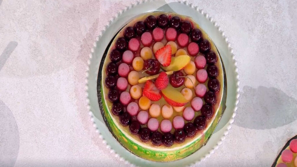 Infine, stendiamo sulla superficie della torta un velo di gelatina al limone e decoriamo con le gelatine di frutta congelate, preparando così una presentazione accattivante.