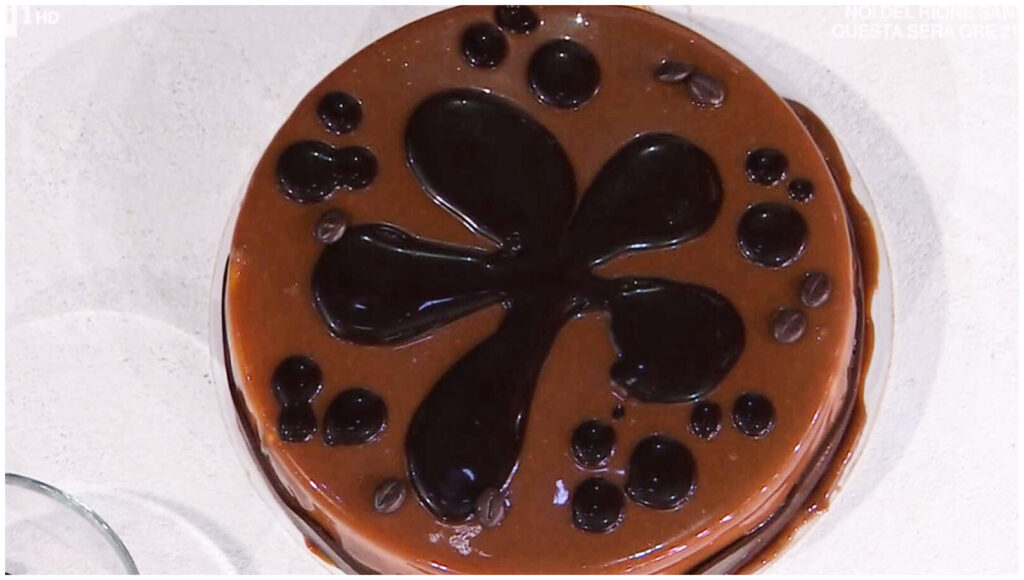 Per la glassa, in un pentolino facciamo sciogliere panna, zucchero, acqua, glucosio e latte condensato fino a raggiungere il punto di ebollizione. Uniamo il caffè solubile e i cioccolati fusi, mescolando continuamente fino a raggiungere i 100°C. Lasciamo raffreddare.