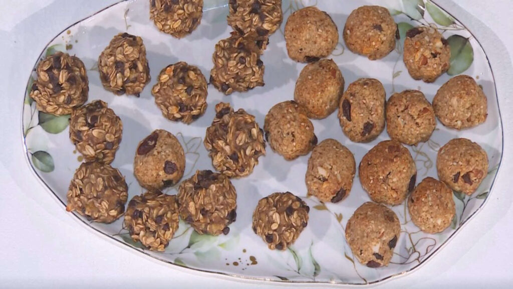 Nel frattempo, prepariamo un secondo impasto. In un frullatore, uniamo le mandorle a lamelle, i datteri denocciolati (oppure le albicocche disidratate o le prugne secche) e i fiocchi di avena. Frulliamo grossolanamente fino a ottenere un composto compatto. Trasferiamo questo mix in una ciotola e integriamo l’uvetta, un goccio d’acqua, l’olio di semi e un cucchiaio di semi di sesamo. Anche qui, mescoliamo bene con le mani fino a che tutti gli ingredienti siano ben amalgamati.