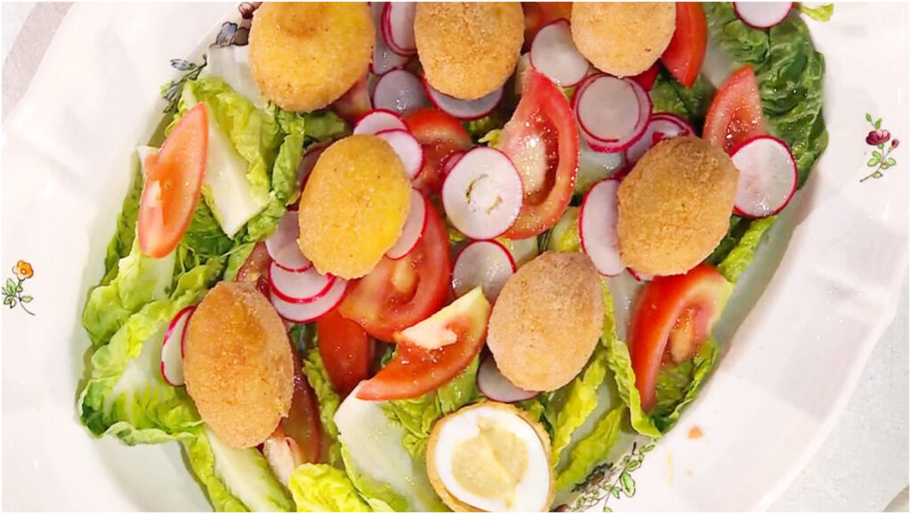 Prosegui riempiendo le metà bianche delle uova con la besciamella preparata. Chiudi le uova sovrapponendo le metà, quindi riponile in frigorifero per un’oretta. Prima di friggerle, passale nella farina, poi nelle uova sbattute e infine nel pangrattato. Riscalda abbondante olio in una padella profonda e friggi le uova fino a doratura perfetta. Scolale su carta assorbente per eliminare l’eccesso d’olio e servile accompagnate da un mix di insalata verde, pomodorini e fette di ravanello. Prepara una salsa fresca mescolando yogurt greco, erba cipollina, scorza di limone e un filo d’olio, da servire a parte o sopra le uova.