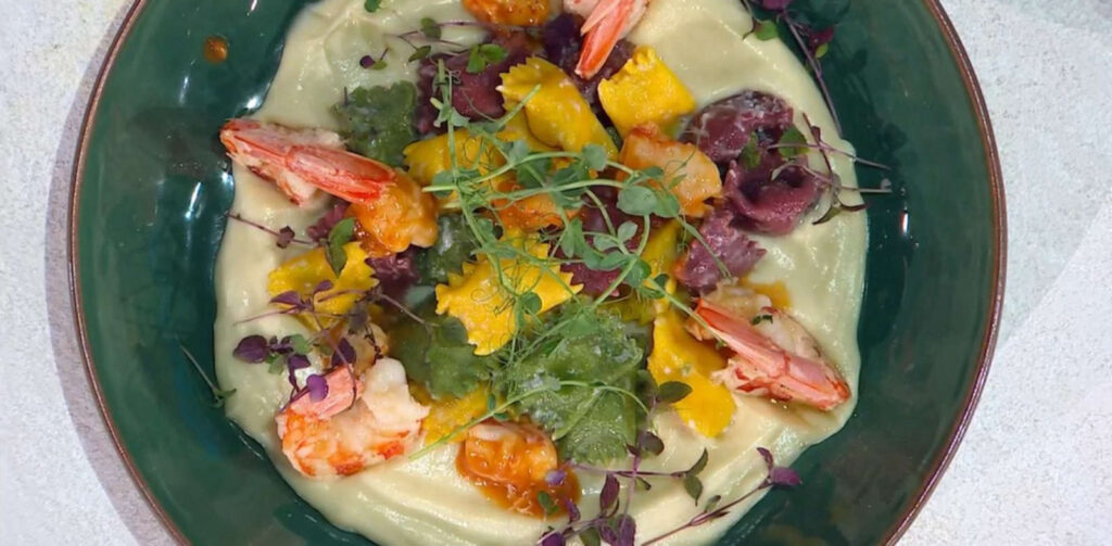 Quando i ravioli sono pronti, scoliamoli e riponiamoli in una ciotola con una noce di burro per mantecare. Serviamo i ravioli su un letto di crema realizzata frullando il sedano rapa cotto con panna e condendo con sale e olio. Completate il piatto con i gamberi saltati e quelli interi per rendere il piatto ancora più attraente.
