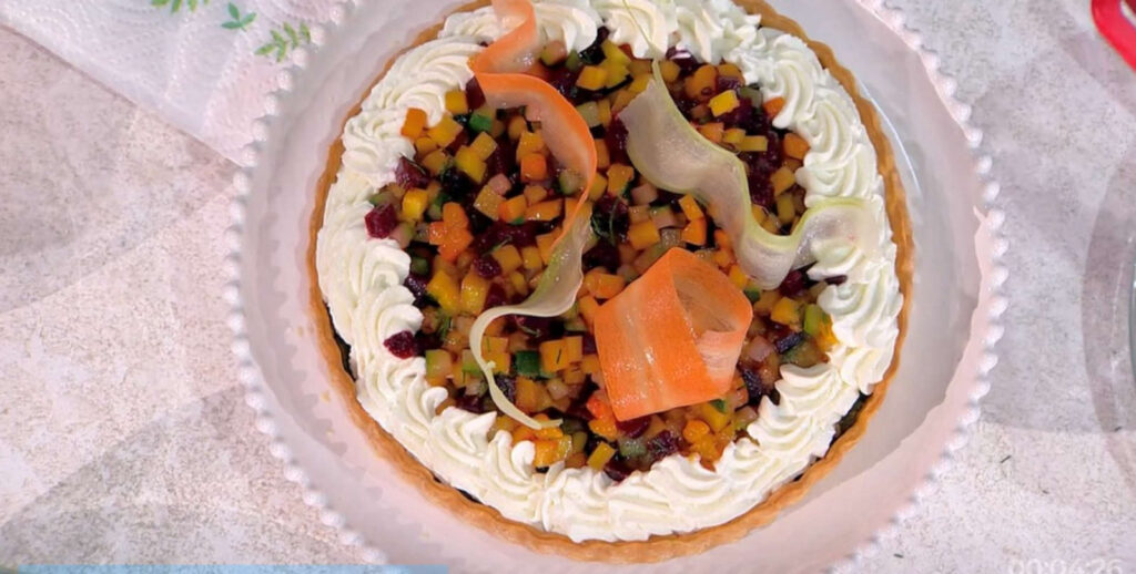 In una ciotola capiente, mescoliamo le verdure tagliate a coriandoli e sbollentate; condiamo con sale, pepe e un filo d’olio, profumando con aneto fresco e pepe rosa a piacere. Quando la torta sarà raffreddata, decoriamo la superficie con i coriandoli di verdure e ciuffi di mousse di formaggio, completando con strisce di sedano e carote.