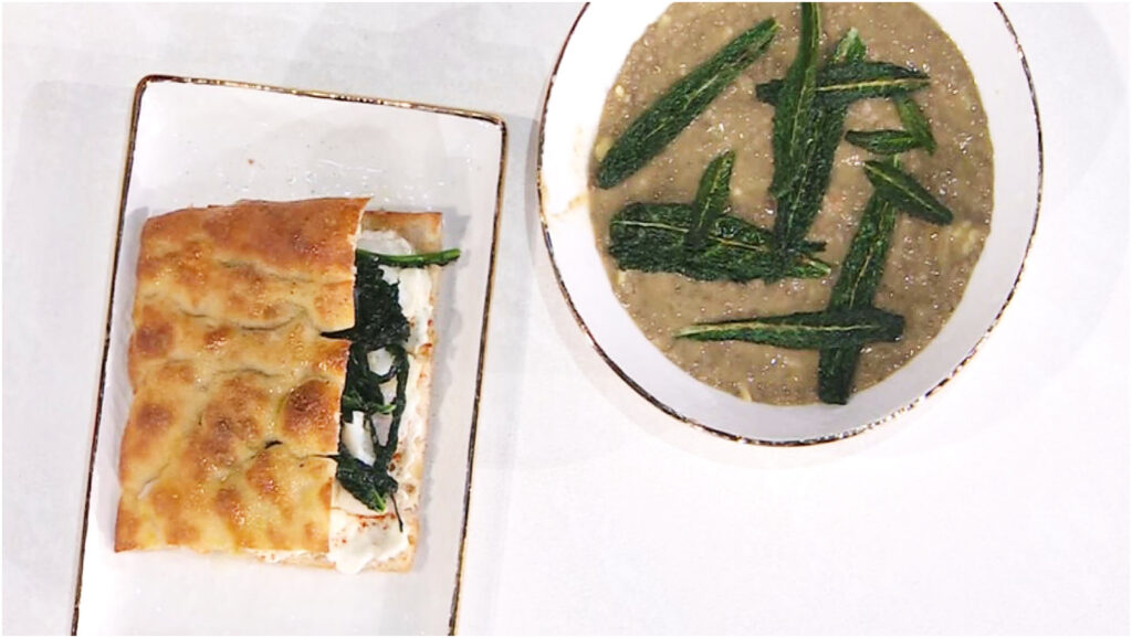 Infine, impiatta la pasta mista con lenticchie e, per dare un tocco finale, guarnisci con del cavolo nero disidratato al lato della focaccia farcita. Questo piatto non solo colpirà per i suoi sapori ricchi e armoniosi, ma sarà anche un’opera d’arte per gli occhi.