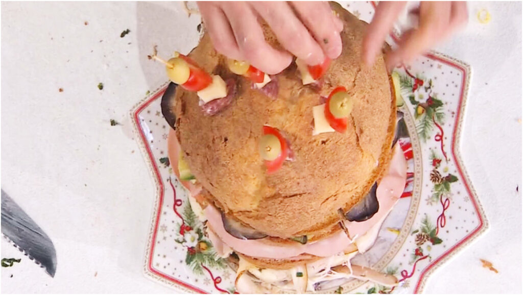 Per personalizzare ulteriormente il tuo panettone gastronomico, puoi considerare alcune gustose varianti. Ad esempio, per un tocco di freschezza, aggiungi delle fettine di cetriolo o pomodorini freschi tra i vari strati. Se desideri un sapore più intenso, prova a sostituire la ricotta con un formaggio cremoso come il mascarpone o il caprino, insaporito con erbe aromatiche. Per chi ama i sapori dolci e salati, l’abbinamento tra gorgonzola e pere caramellate può essere un’ottima scelta. Infine, per un’opzione vegetariana, sostituisci la porchetta con affettati di seitan o tofu marinato. Buona preparazione e buon appetito!