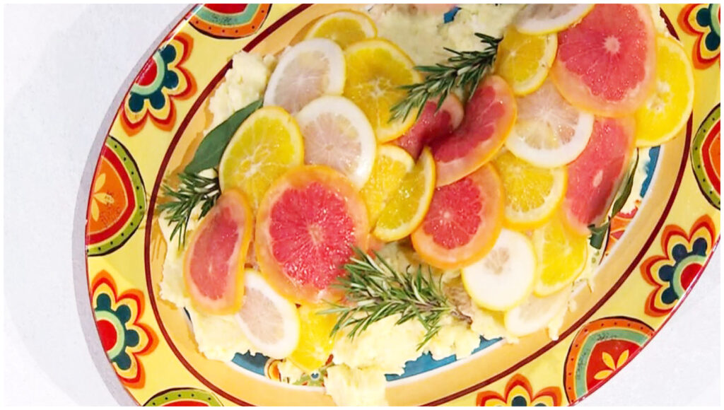 Prepariamo anche le decorazioni di agrumi: tagliamo arance, limoni e pompelmo a rondelle e li sbollentiamo in acqua e zucchero. Disponiamo le fettine in una teglia, sovrapponendole leggermente, e spennelliamo con gelatina fusa nell’infuso di tè. Lasciamo raffreddare in frigorifero per almeno mezz’ora.