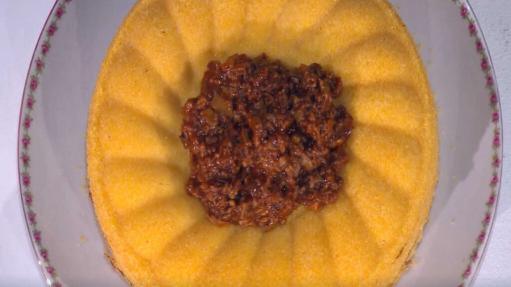 Una volta cotto, sformiamo il nostro sformato e riempiamo il centro con il ragù di funghi preparato in precedenza.