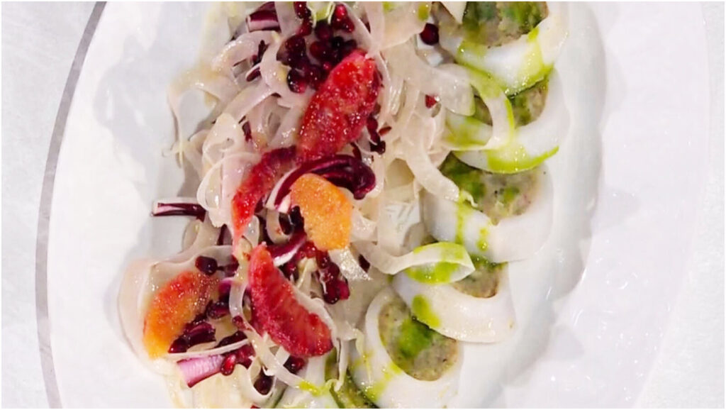 Per preparare l’insalata che accompagnerà il piatto, facciamo ridurre il succo delle arance con un pizzico di macis o noce moscata in un pentolino, finché non sarà dimezzato. In una ciotola, mescoliamo i finocchi affettati, il radicchio, i chicchi di melagrana e le arance pelate a vivo. Condiamo il tutto con olio extravergine d’oliva, sale e la riduzione d’arancia. Serviamo i calamari tagliati a fette, accompagnati dall’insalata e decorati con un filo d’olio al basilico e briciole di pane tostato aromatizzato.