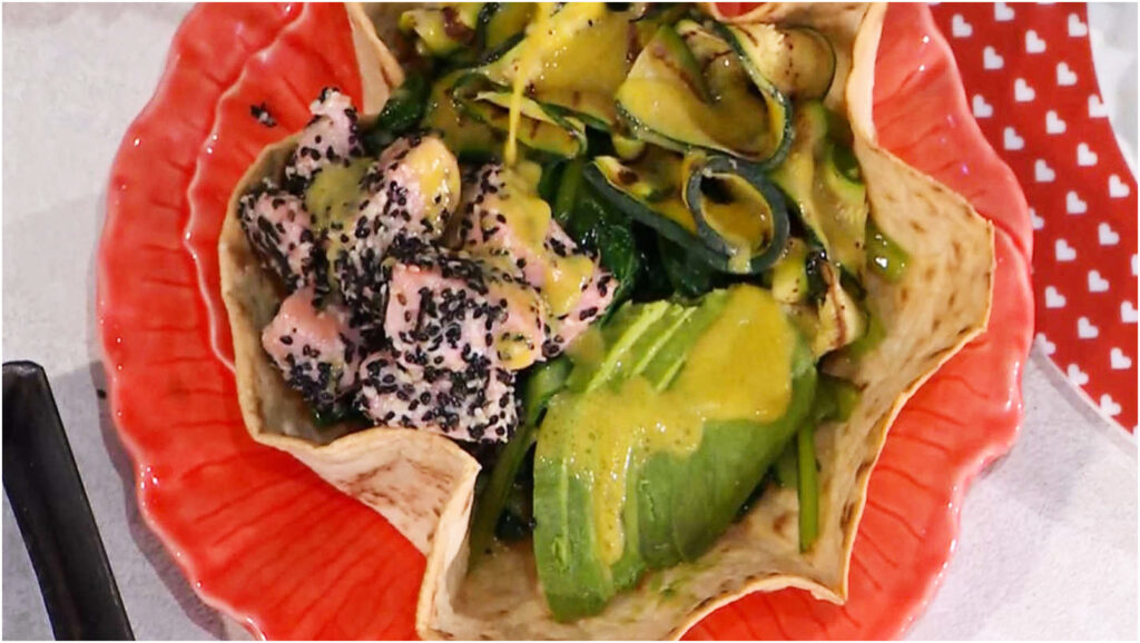 Adesso siamo pronti per assemblare il nostro poke. All’interno del cestino croccante di piadina, disponiamo le biete ripassate, aggiungiamo le zucchine grigliate su un lato, la polpa dell’avocado tagliata a fettine sottili sull’altro e infine il salmone cotto al forno. Completiamo il piatto colando sopra la salsa alla senape e gustiamo il risultato di questo viaggio culinario!