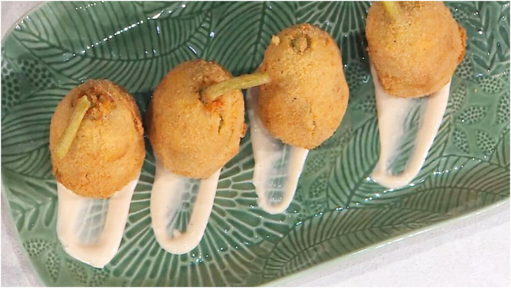 Ora, con il ripieno pronto, forma delle polpette che richiamino la forma originale dei carciofi. Inserisci alla base ciascuna polpetta il gambo dei carciofi per un tocco autentico. Passa quindi le polpette nella farina, poi nell’uovo sbattuto e infine nel pangrattato, assicurandoti che siano ben impanate. Scalda abbondante olio di semi in una padella profonda e friggi le polpette fino a doratura, girandole con attenzione.