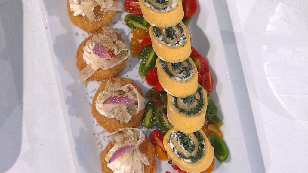Come contorno, tagliamo i pomodori a fette e li saliamo, lasciandoli scolare su una griglia per rimuovere l’acqua in eccesso. Per la panatura dei pomodori, prepariamo una pastella mescolando farina di ceci con acqua fredda, quindi infariniamo le fette di pomodoro prima di immergerle nella pastella. Infine, le ricopriamo con un mix di panko e pangrattato e friggiamo in olio caldo fino a doratura, aggiungendo pezzi di cipolla per aromatizzare l’olio.