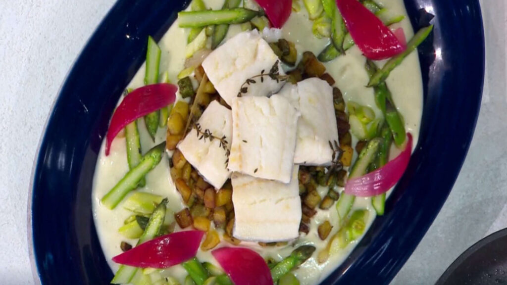 Infine, preparate la salsa frullando parte dell’acqua di cottura del baccalà con del lemongrass e dell’olio. Ora siete pronte per impiattare! Create un letto di crema di patate sul piatto, adagiatevi sopra le verdure croccanti e, infine, completate con i tranci di baccalà. Guarnite con gli asparagi spadellati e con le punte crude, per un tocco di freschezza in più.