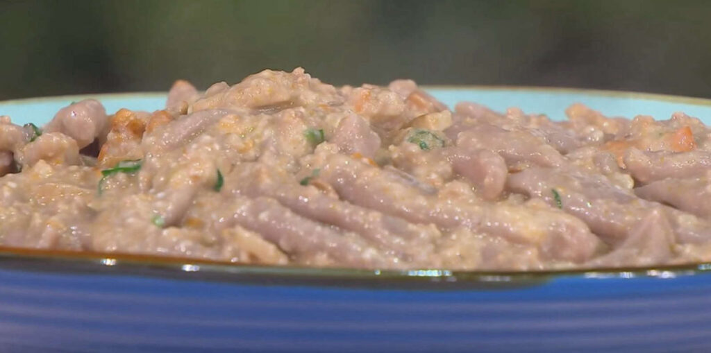 In un’atmosfera accogliente e familiare, Fabio Potenzano porta in tavola una delle sue creazioni più evocative, gli gnocculi al nero d’Avola. Questa antica pasta fresca siciliana è un omaggio alla tradizione e alla semplicità, ma con un tocco di raffinatezza dato dal celebre vino rosso siciliano. La ricetta di oggi non solo celebra il patrimonio culinario della Sicilia, ma è anche dedicata a una telespettatrice speciale che festeggia il suo 87° compleanno.