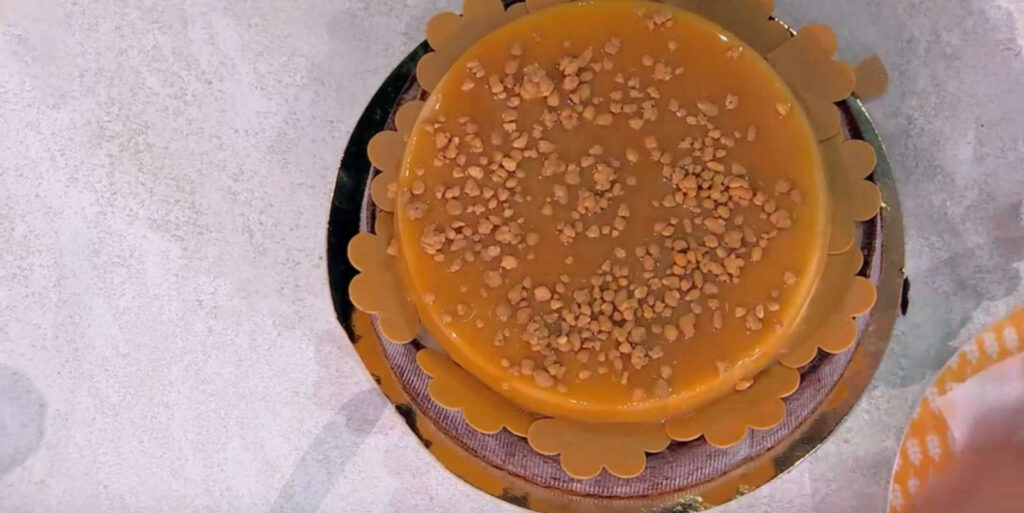 5. Al caramello rimasto, incorporate la panna semimontata e versate il composto in un anello di silicone, poi congelatelo.