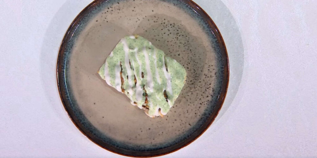 Una volta pronta, decoriamo la millefoglie con la besciamella verde e bianca e ultimiamo con qualche goccia di olio al rosmarino.
