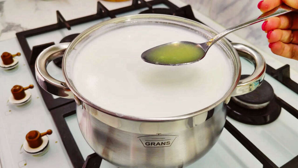- Quando il latte raggiunge circa 85°C, togli dal fuoco e aggiungi il succo di limone. Mescola delicatamente e lascia riposare per 10-15 minuti, finché non si formeranno dei coaguli.