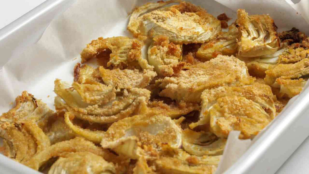 - Dispone i finocchi su una teglia da forno, quindi cospargi il mix di pangrattato sopra.