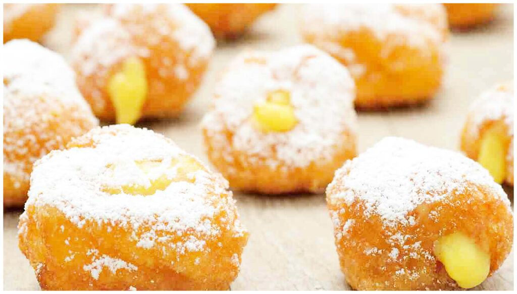 - Farcisci ogni frittella con crema pasticcera e spolvera con zucchero a velo.