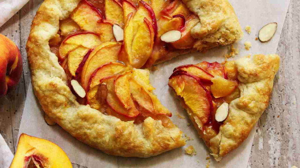 Per preparare una galette alle pesche, avrai bisogno di pesche mature, pasta brisée, mandorle tritate e confettura di pesche.