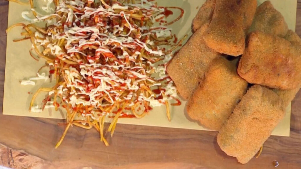 Per il contorno, tagliate le patate a strisce sottili (stick) e friggetele fino a renderle dorate e croccanti. Scolatele su carta assorbente e salatele prima di servirle, magari affiancate dalla salsa all’aglio e da del ketchup.