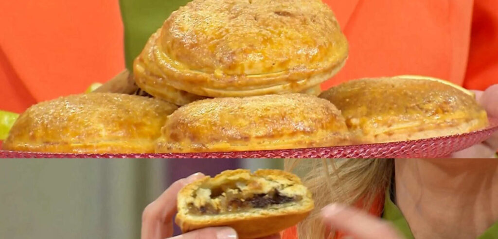 Riprendete l’impasto dal frigorifero e stendetelo fino a raggiungere uno spessore di circa 3 mm. Ritagliate dei dischi del diametro di circa 10 cm. Spennellate i bordi di un disco con l’uovo sbattuto e mettete al centro un cucchiaio abbondante di ripieno alle pere. Coprite con un altro disco di impasto e premete i bordi con una forchetta per sigillare.