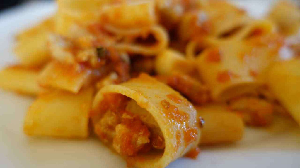 Gli ingredienti principali per preparare i paccheri al tonno sono paccheri, tonno in scatola, salsa di pomodoro, cipolla e olio extravergine d’oliva.