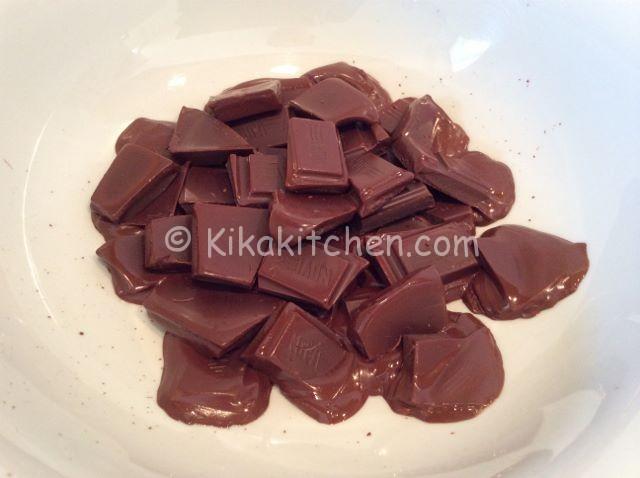 Iniziare la preparazione della crema al cioccolato fondente tagliando la barretta di cioccolato a pezzetti. Sciogliere il cioccolato fondente a bagnomaria.