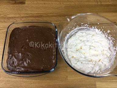 Trasferire la crema al cioccolato ormai fredda all’interno di un ampio recipiente e mescolarla energicamente con la frusta per ripristinare la consistenza cremosa. Aggiungere la panna montata alla crema.