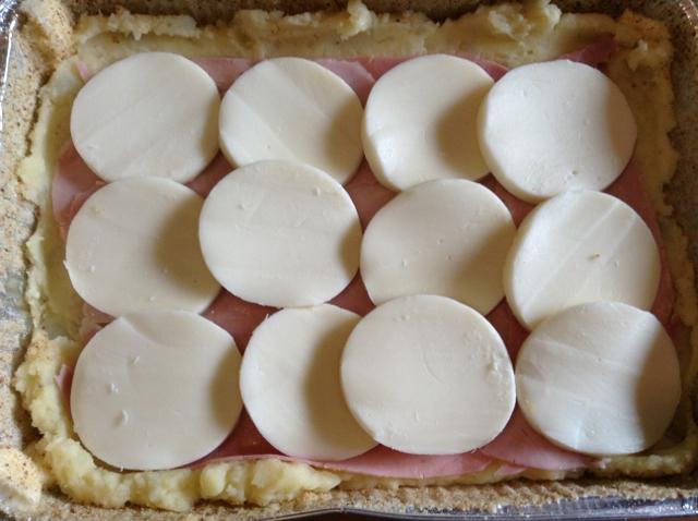 Versare del purè nella teglia e livellarlo, aggiungere poi uno strato di prosciutto cotto e uno di formaggio.
