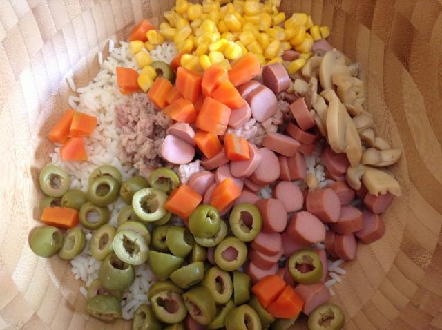 Aggiungere al riso gli ingredienti preparati in precedenza quindi pomodorini, mais, carote, piselli, tonno, wurstel, funghi, olive.