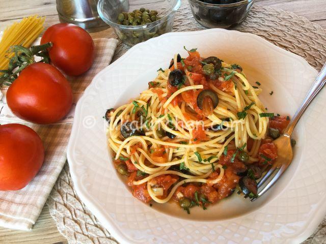 La pasta alla puttanesca è un piatto tipico della tradizione napoletana “aulive e cchiapparielle” (olive e capperi). Un primo piatto ricco, molto saporito e di facile realizzazione. Di seguito la preparazione sia con le acciughe che senza. La pasta alla puttanesca napoletana prevede salsa di pomodoro fresco con olio, aglio, olive nere preferibilmente si Gaeta, capperi e origano. Una delle varianti più famose è quella laziale con aggiunta di acciughe e prezzemolo oppure origano e peperoncino. Altre varianti prevedono l’aggiunta di tonno. La pasta più frequentemente utilizzata con il sugo alla puttanesca sono gli spaghetti. Il piatto è infatti conosciuto anche con il nome di spaghetti alla puttanesca.