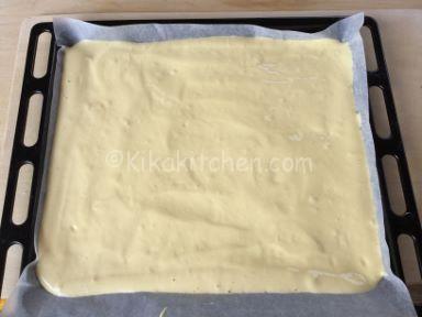 Versare il composto ottenuto su una leccarda rivestitia di carta forno, la classica teglia nera, bassa, in dotazione nei forni. Distribuire l’impasto in modo uniforme e livellare bene.