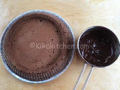 Versare la ganache al cioccolato sulla base morbida, distribuire e livellare bene.