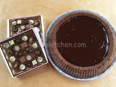 Lasciare raffreddare la base e nel frattempo preparare la ganache. Scaldare la panna in un pentolino e tagliare il cioccolato a pezzetti; è possibile utilizzare solo cioccolato fondente oppure metà fondente e metà al latte. Per chi invece non gradisse il sapore troppo intenso del cioccolato fondente è possibile utilizzare solo cioccolato al latte oppure aggiungere alla ganache dello zucchero a velo.