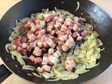 Aggiungere la pancetta tagliata a dadini e cuocere fino a che il grasso risulterà trasparente.