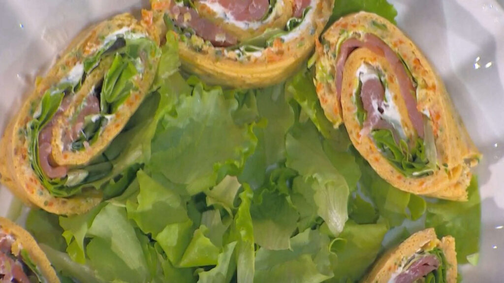 Quando la frittata è fredda, spalmiamo sopra un generoso strato di formaggio spalmabile, completando con un trito di erbe aromatiche fresche. Successivamente, distribuiamo il lattughino e il salmone affumicato (o il salume scelto) sulla superficie. Per dare forma al rotolo, partiamo dal lato lungo e arrotoliamo delicatamente la frittata su se stessa, cercando di mantenere il ripieno all’interno. Infine, avvolgiamo il rotolo in pellicola trasparente e lasciamo riposare in frigorifero per un’ora. Al momento di servire, tagliamo il rotolo a fette e gustiamolo!
