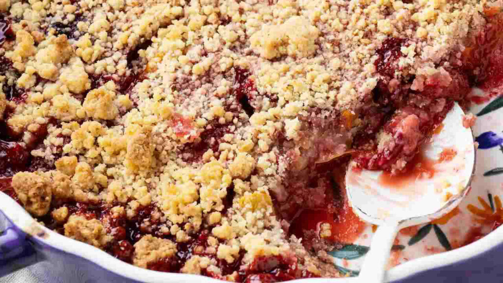 - Cuoci in forno pre-riscaldato a 180°C per circa 40 minuti o fino a quando la sbriciolata è dorata.
