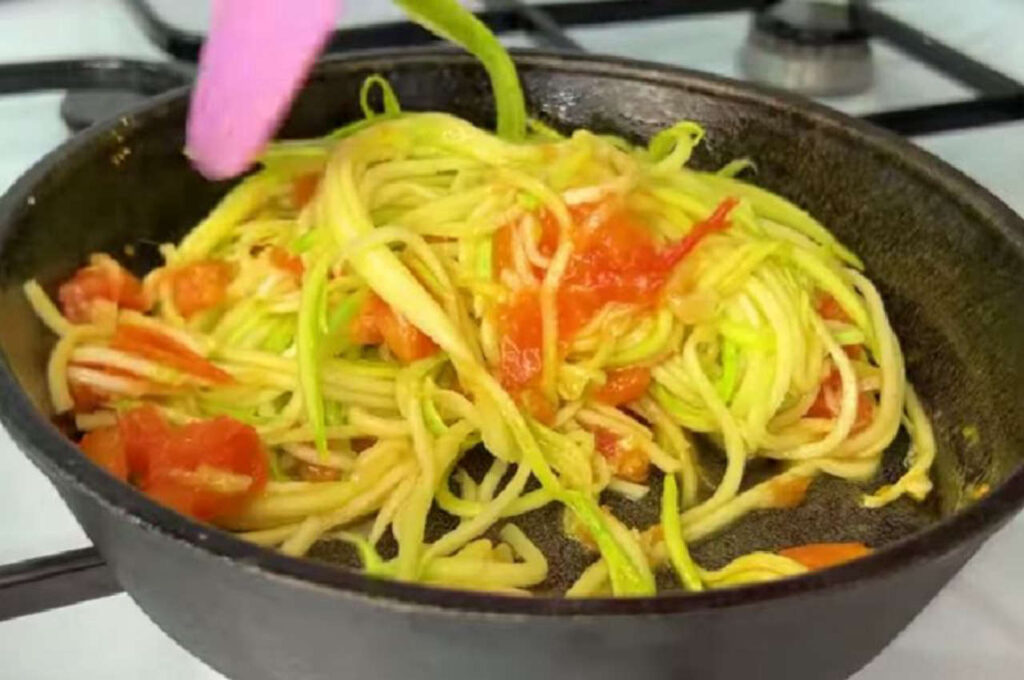 - Unisci gli spaghetti di zucchine nella padella e mescola delicatamente per farli insaporire con il sugo di pomodoro. Cuoci per 2-3 minuti.
