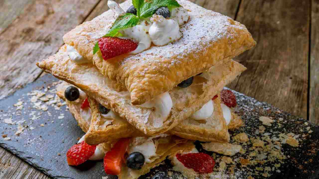 6. Mentre la pasta sfoglia cuoce, prepara la crema chantilly. In una ciotola, monta la panna fresca con lo zucchero a velo e l’estratto di vaniglia fino a ottenere una consistenza soda.
