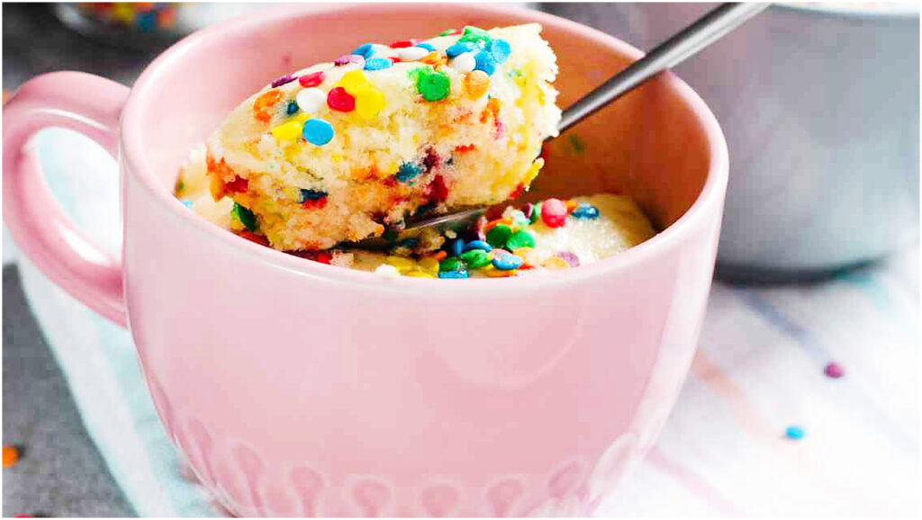- Lascia raffreddare per un paio di minuti, poi decora con i confettini rimasti e gusta la tua torta in tazza!