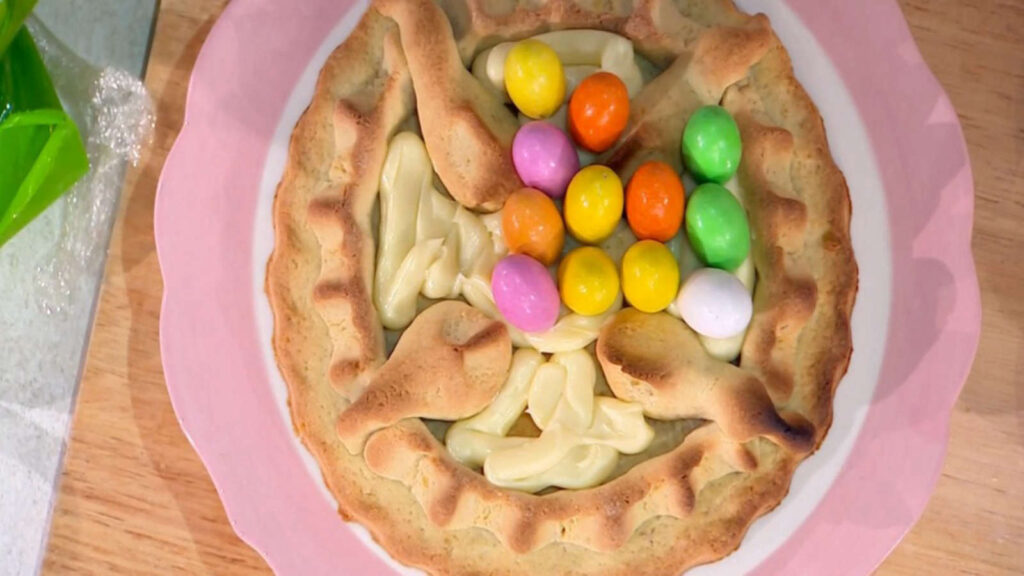 Una volta trascorso il tempo di riposo, stendiamo la frolla su una superficie infarinata, portandola a uno spessore di circa 1 cm. Con un coppapasta, ritagliamo un disco e formiamo un salsicciotto con i ritagli, adagiandolo attorno al disco per creare un effetto nido. Decoriamo i bordi pizzicando con le dita e formiamo anche piccoli uccellini con la frolla avanzata, che posizioneremo sui bordi del nido. Spennelliamo il tutto con l’uovo sbattuto e facciamo cuocere in forno preriscaldato a 210° per 25 minuti.
