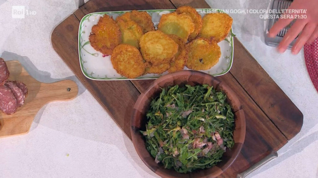 Per il contorno, laviamo il tarassaco fresco e lo trasferiamo in una ciotola, conditelo con un filo d’olio e un pizzico di sale. Aggiungiamo la pancetta ancora calda, inclusi i succhi di cottura, e mescoliamo bene per insaporire.