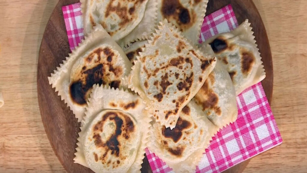 Successivamente, prendiamo il panetto e stendiamolo su una superficie infarinata con l’aiuto di un mattarello, creando un disco sottile. Disporre il ripieno di bietole e patate al centro dell’impasto, aggiungendo anche della caciotta grattugiata per un tocco extra di sapore. Ripieghiamo l’impasto sul ripieno, pressando bene i bordi per sigillare il tortello. Con un coltello o una rotella tagliapasta, ritagliamo dei quadrati che andremo a cuocere su una piastra o in una padella ben calda a fuoco basso. Cuociamo ogni tortello per circa 5 minuti per lato, finché non saranno dorati e croccanti.
