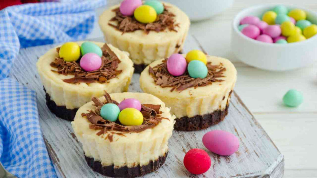 Risposta: Per preparare le tortine di Pasqua, avrai bisogno di biscotti secchi al cacao, burro, formaggio spalmabile, panna fresca, cioccolato bianco, gelatina e zucchero a velo.